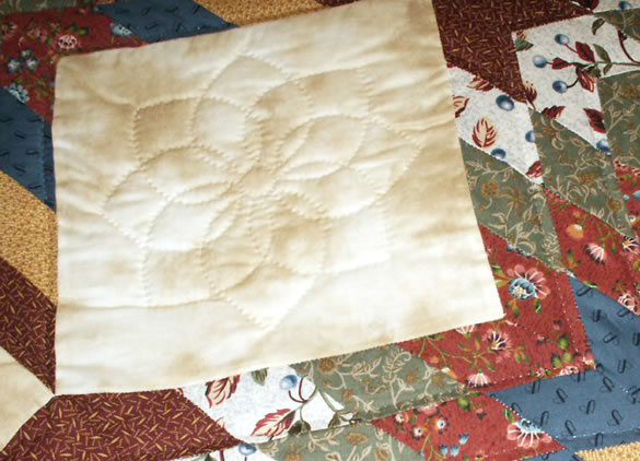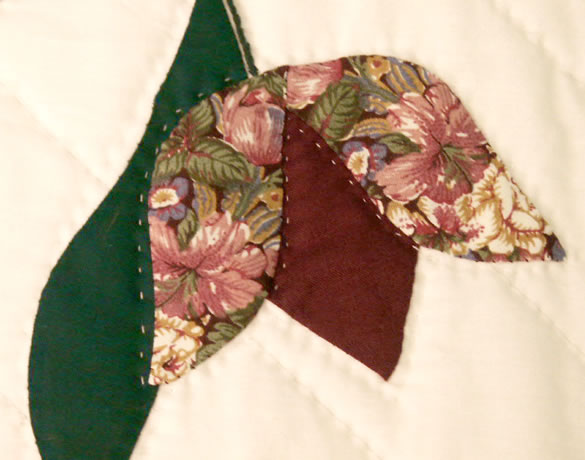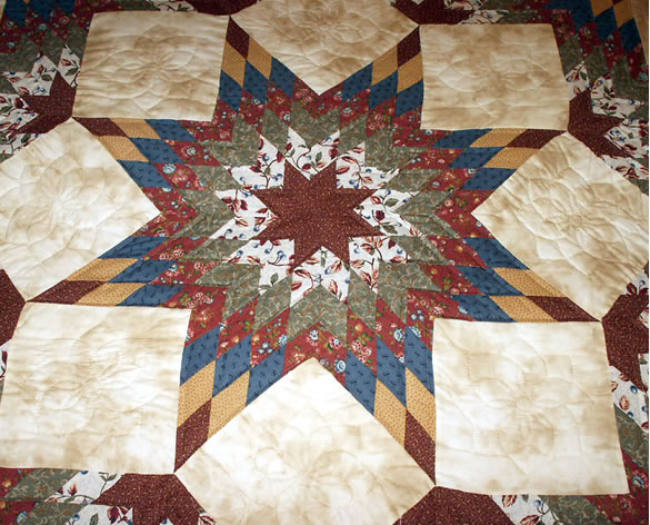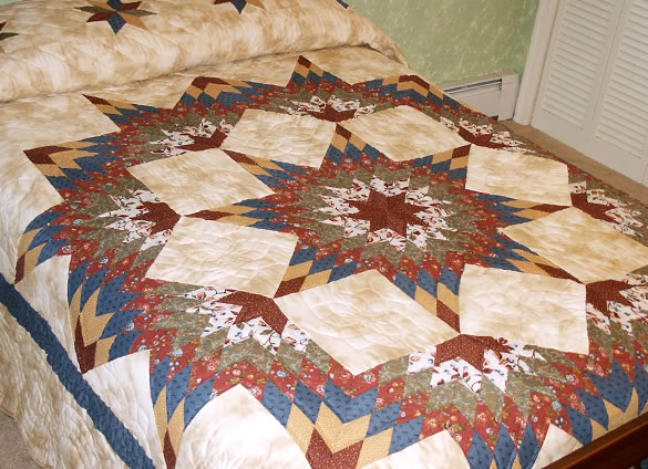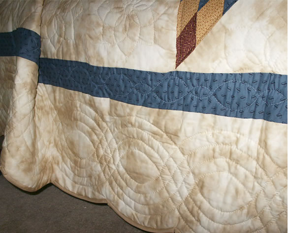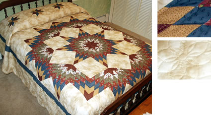 This quilt has been sold. We'd be happy to check with the quilters we work with to see if a similar quilt is nearly completed. Or if you'd like to place a custom order for this quilt, please email us, or call at 610-880-0107, and we can discuss fabric colors, pattern, quilting designs and size. You can also supply us with fabric of your choice, as long as it is 100 percent cotton, or a cotton-poly blend.