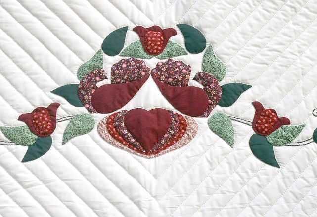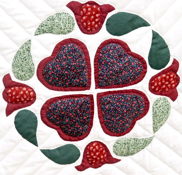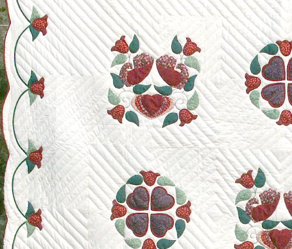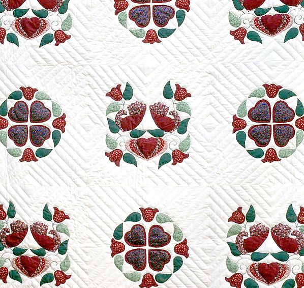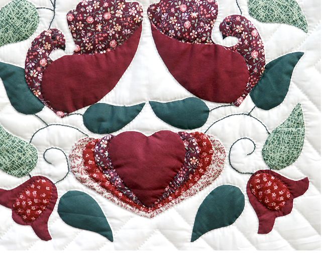 A very Pennsylvania Dutch (German) looking quilt showing off its hearts, songbirds and flowers. The colors are spruce green, burgundies and blue on an off-white background. The appliqués work is excellent with lots of fine quilting. $895.00 |