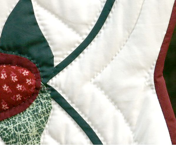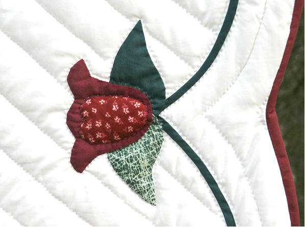 This quilt has been sold. We'd be happy to check with the quilters we work with to see if a similar quilt is nearly completed. Or if you'd like to place a custom order for this quilt, please email us, or call at 610-880-0107, and we can discuss fabric colors, pattern, quilting designs and size. You can also supply us with fabric of your choice, as long as it is 100 percent cotton, or a cotton-poly blend.