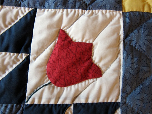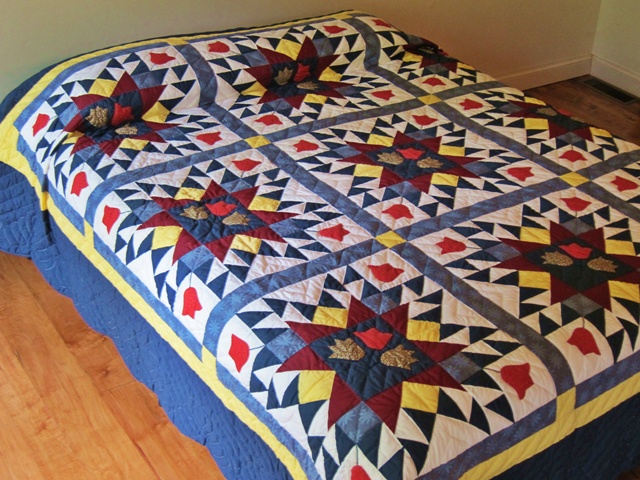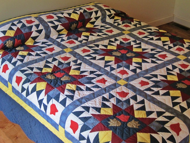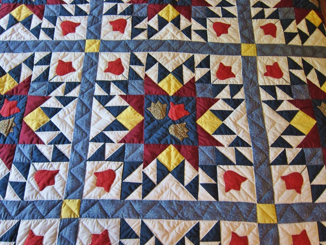 Shades of red, yellow and blue is the dominant colors in this well pieced quilt.