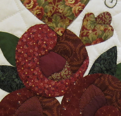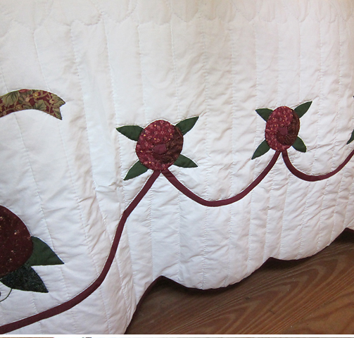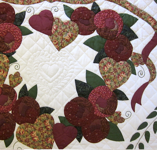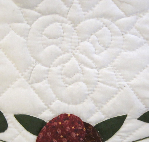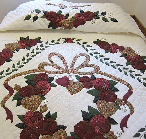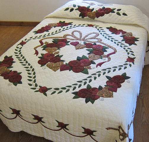 Queen SizeThe stitching is a very high quality with about 7 to 9 stitches per inchInitialed and dated in embroidery by the Quilter on the backReady to ship Shades  of wine and green adorn this detailed quilt.It would make a fantastic wedding gift.