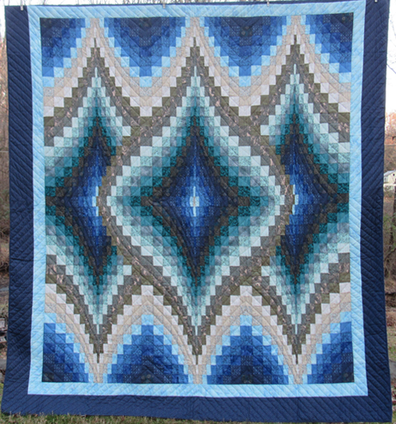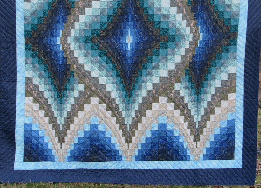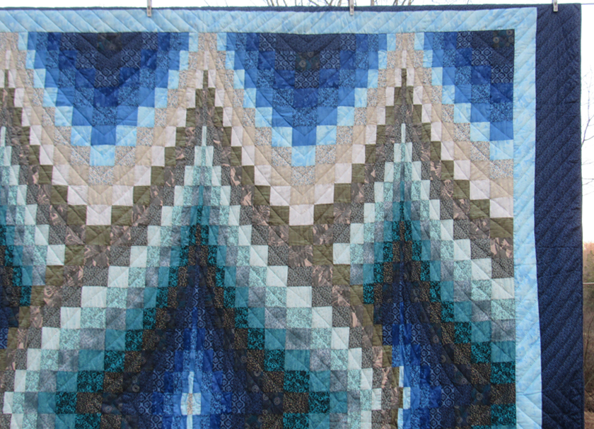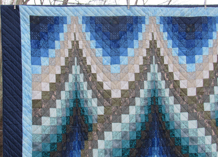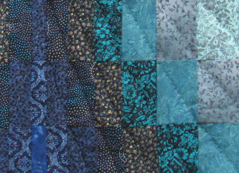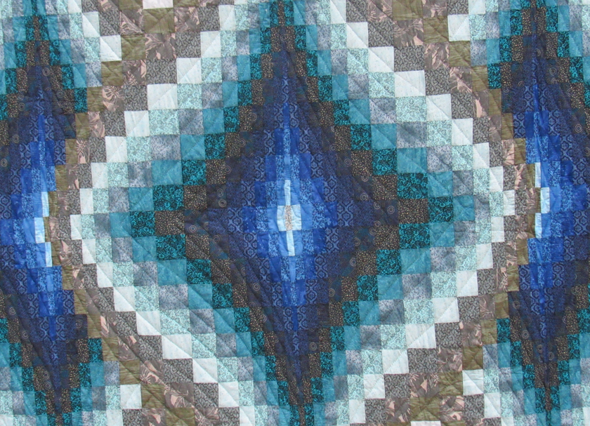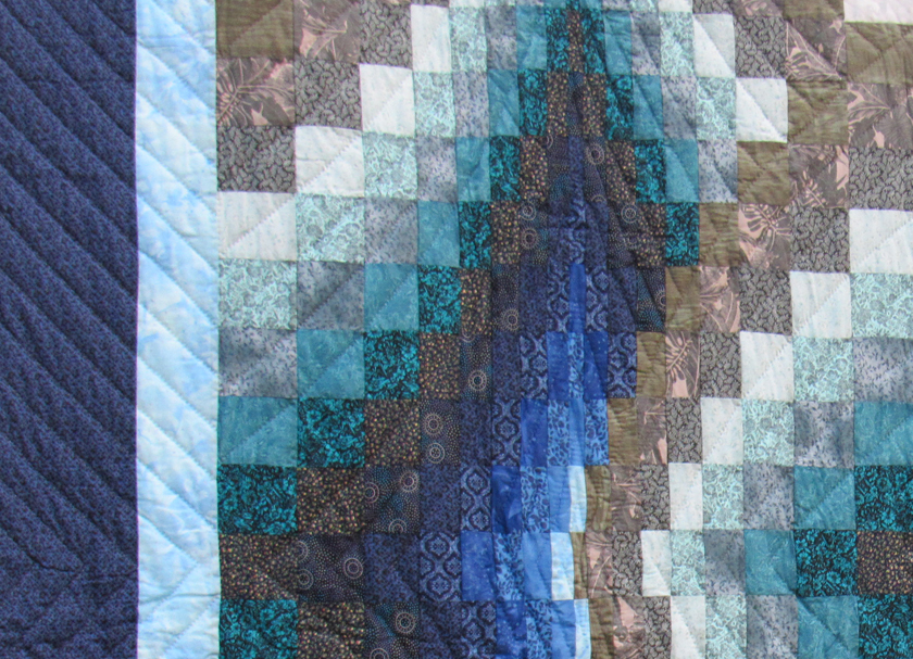 Queen SizeThe stitching is a very high quality with about 7 to 8 stitches per inchInitialed and dated in embroidery by the Quilter on the backReady to ship This magnificent quilt is vivid and will be the focus  of any bedroom.Teals, blues, greens, and tans meld together in  the stunning quilt.