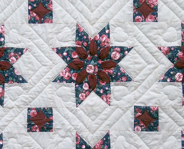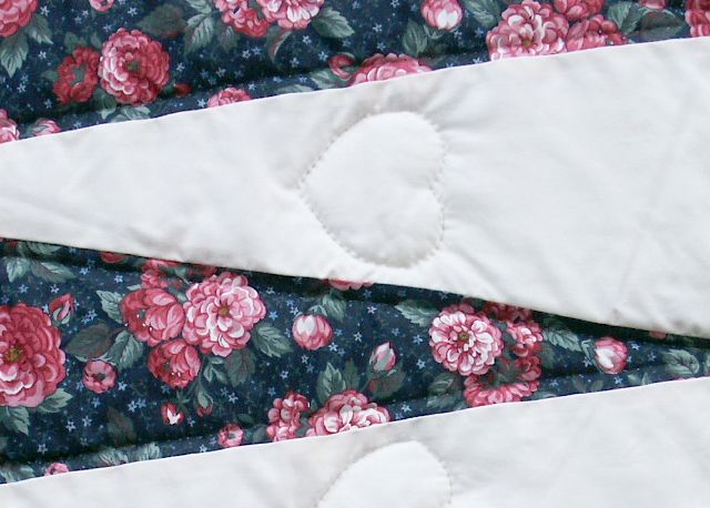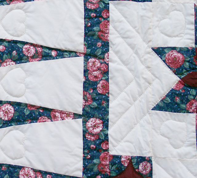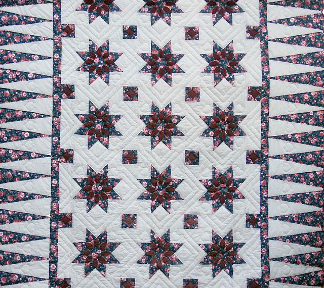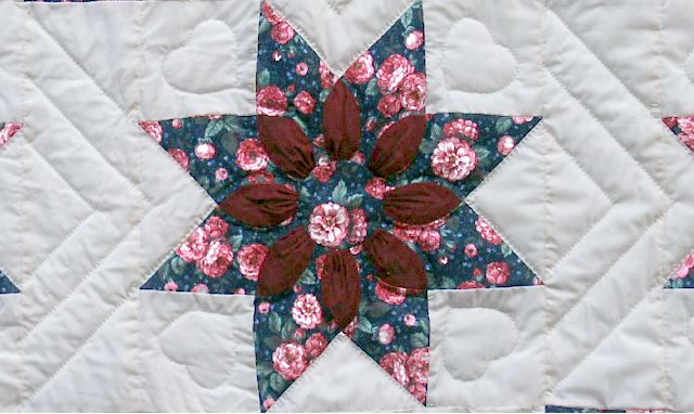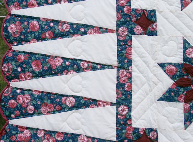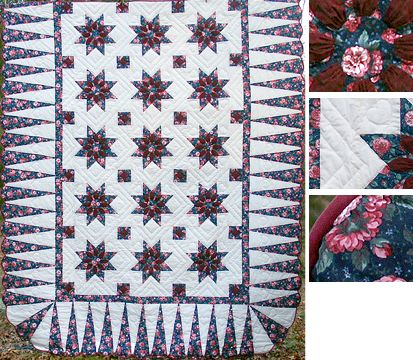 This quilt has been sold. We'd be happy to check with the quilters we work with to see if a similar quilt is nearly completed. Or if you'd like to place a custom order for this quilt, please email us, or call at 610-880-0107, and we can discuss fabric colors, pattern, quilting designs and size. You can also supply us with fabric of your choice, as long as it is 100 percent cotton, or a cotton-poly blend.