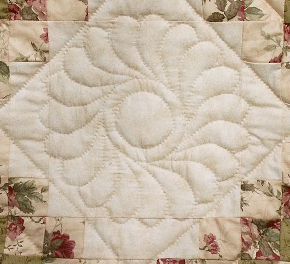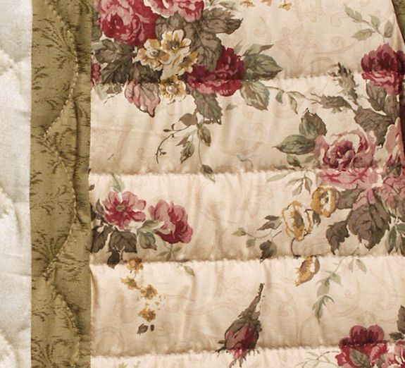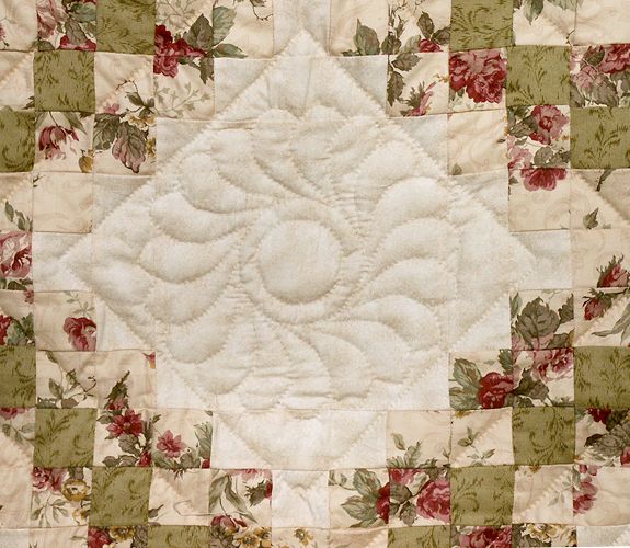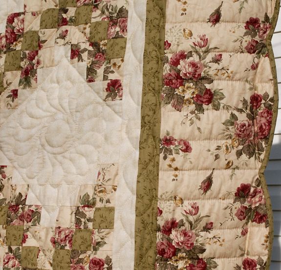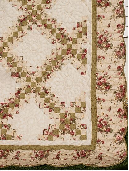 Lovely fabric selection of deep rose and golden green with an antiqued background, adds to the old fashion charm of this quilt. A lovely double sash border is used. $825.00 |