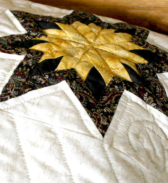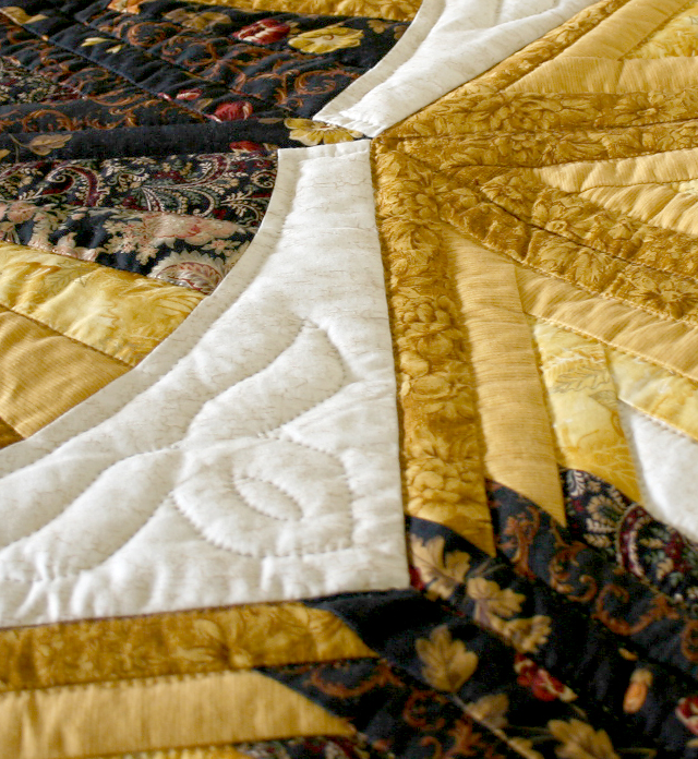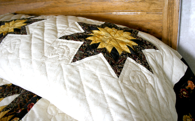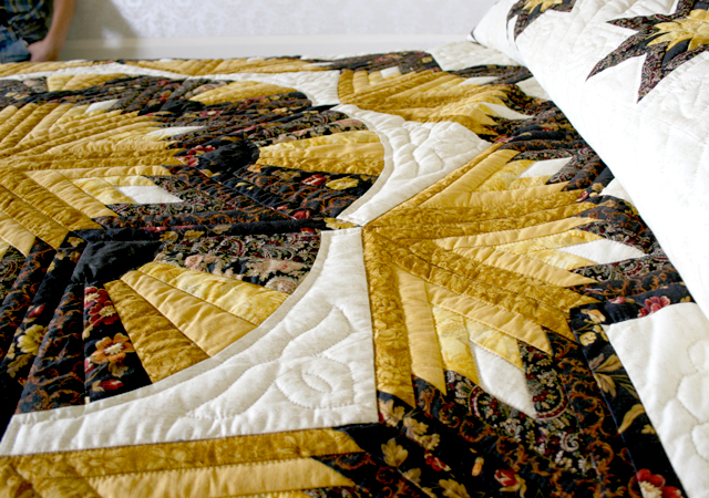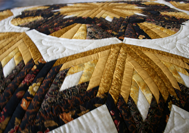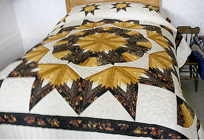 Fabric selections of gold and black add real vitality to this quilt. $845.00 |