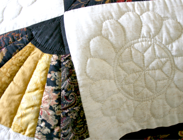 This quilt has been sold. We'd be happy to check with the quilters we work with to see if a similar quilt is nearly completed. Or if you'd like to place a custom order for this quilt, please email us, or call at 610-880-0107, and we can discuss fabric colors, pattern, quilting designs and size. You can also supply us with fabric of your choice, as long as it is 100 percent cotton, or a cotton-poly blend.