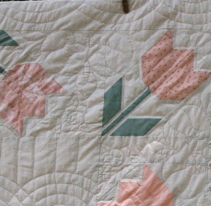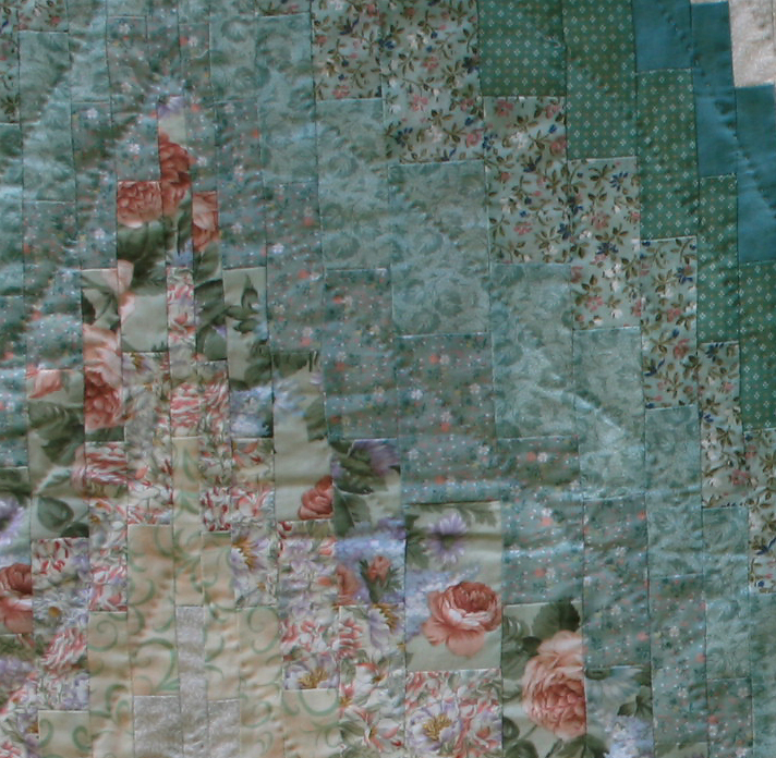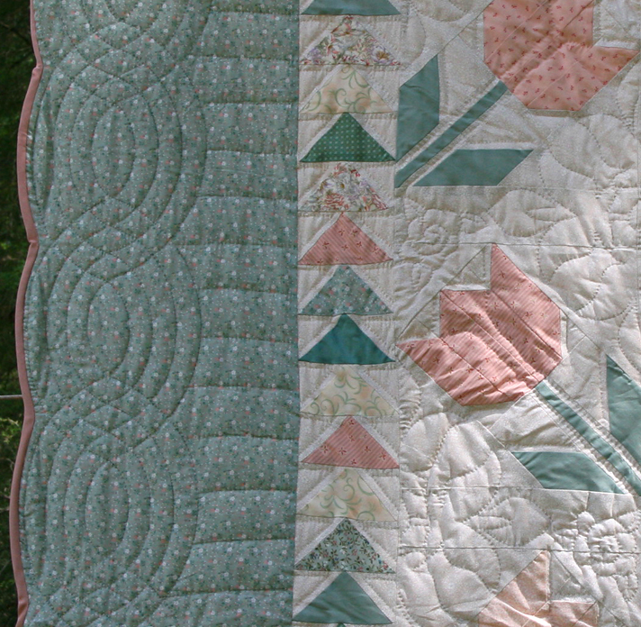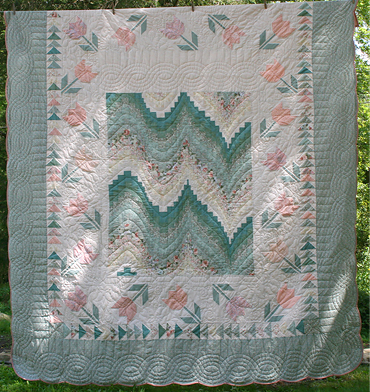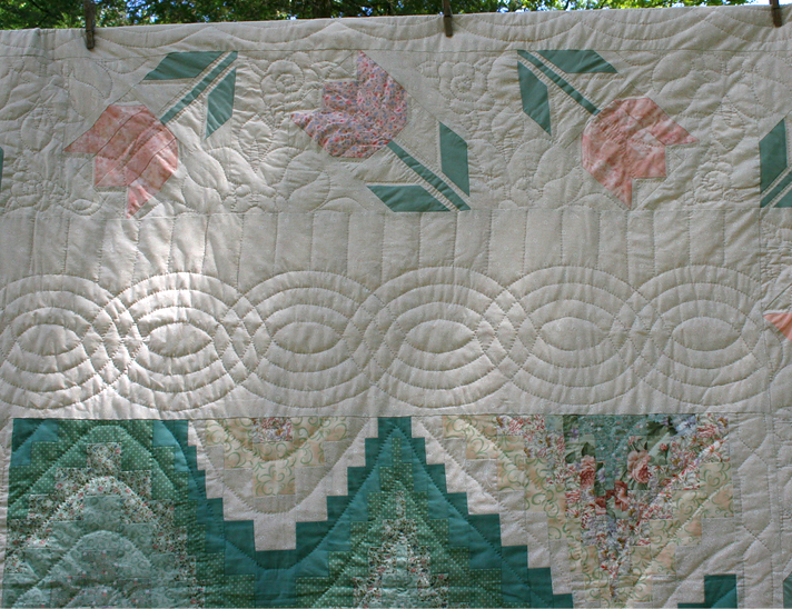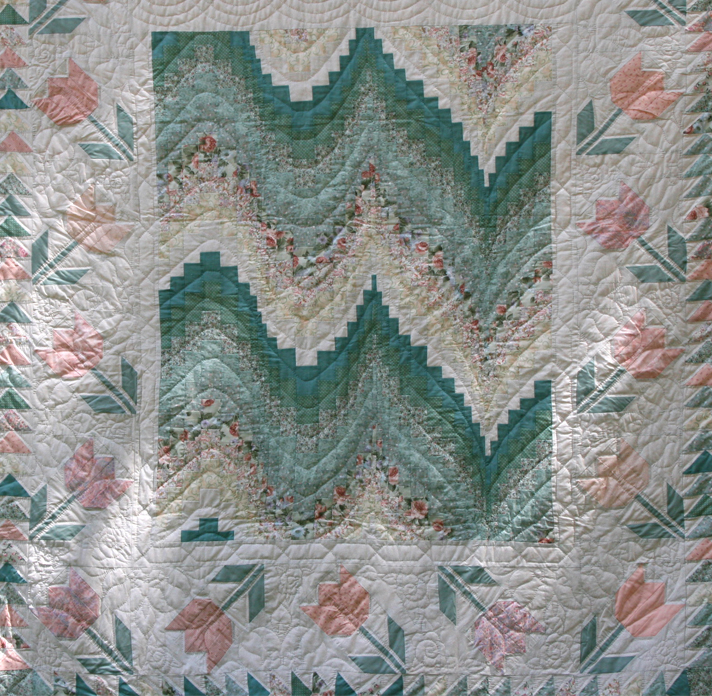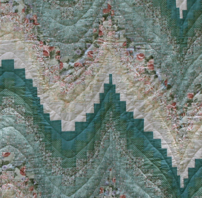 The background is off-white with a small subtle print. Very well pieced and quilted. Done by an Amish woman who designs and quilts a wide variety of quilts. She loves to work on the traditional Amish patterns adding a creative twist with her fabric selections. $825.00 |