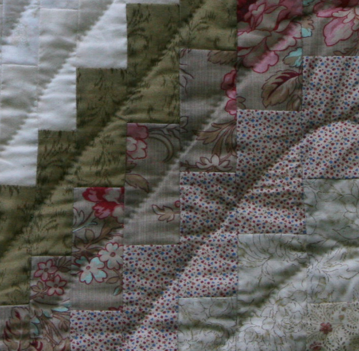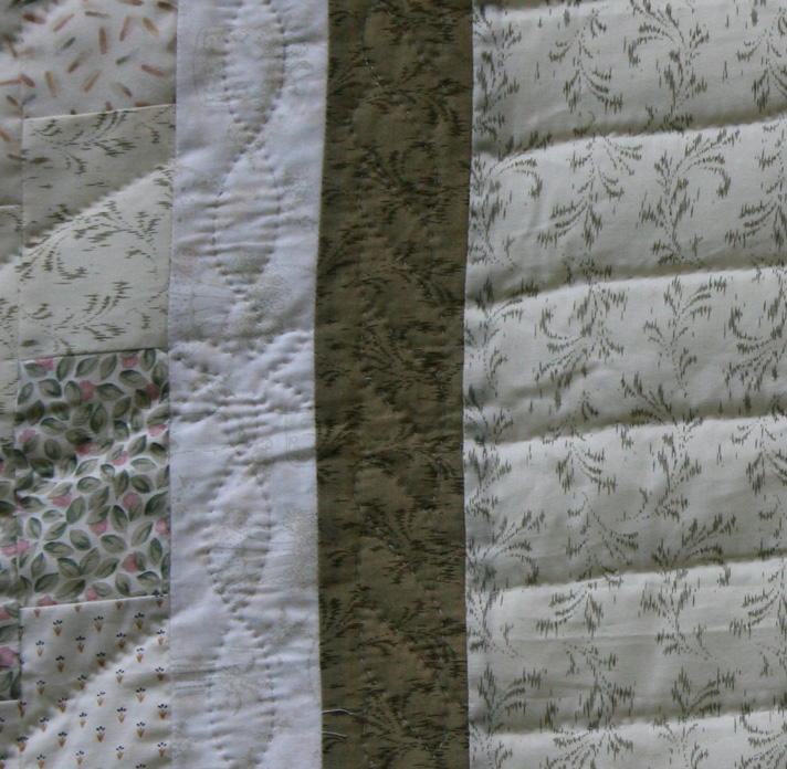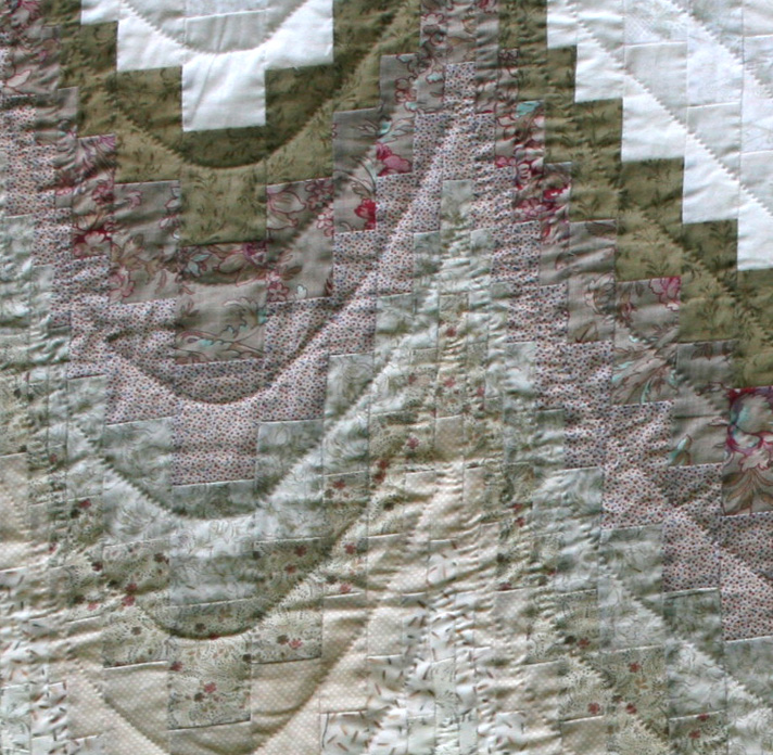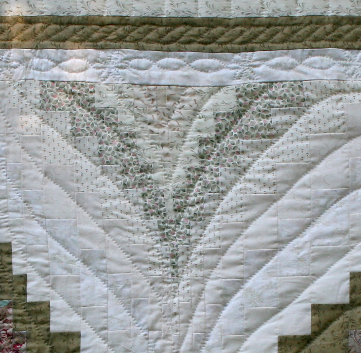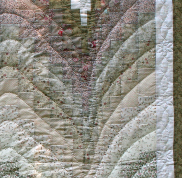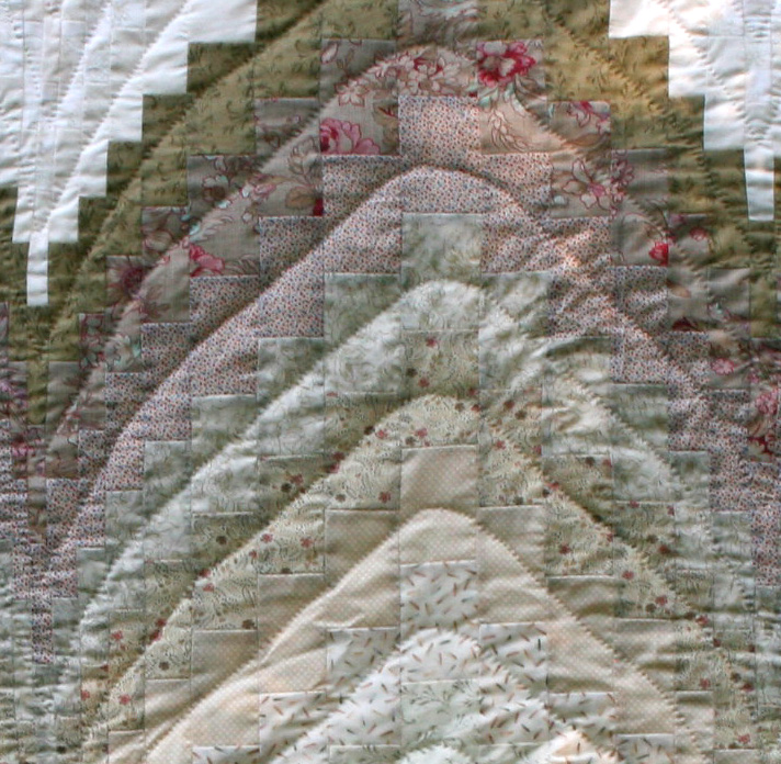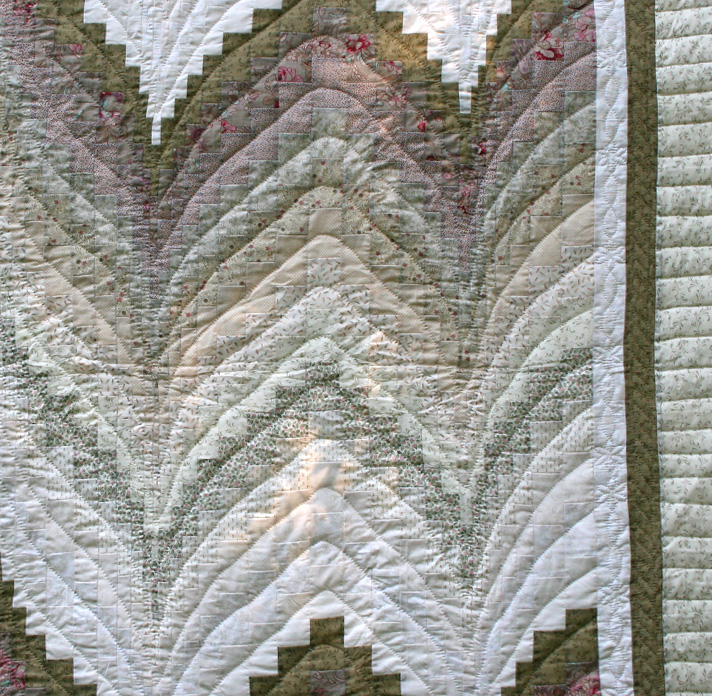 A unquie twist on a Bargello design. The dominate colors are beige and brown with touches of deep red. Excellent piecing and quilting. $795.00 |